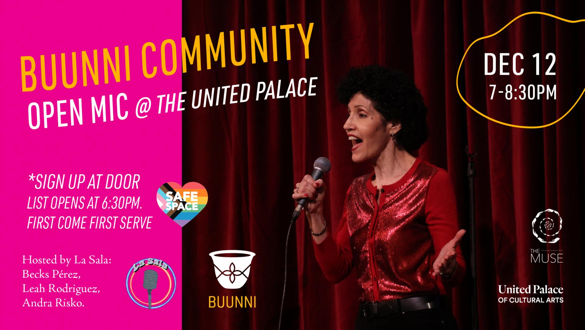The Muse Presents: Buunni Community Open Mic is part of a day-long Holiday Tree Lighting Celebration occurring in and around the United Palace, sponsored by our community partners.