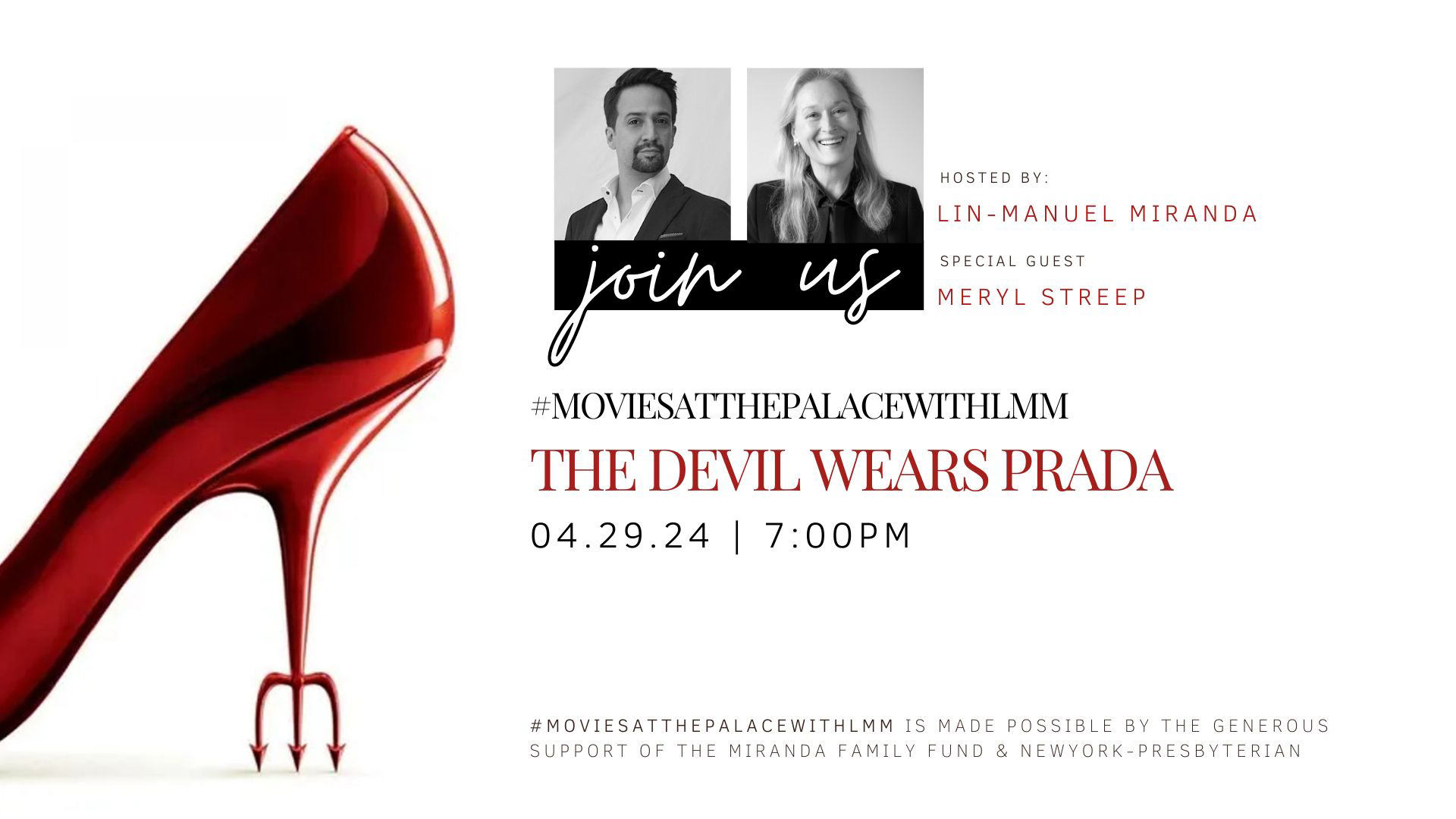 After the screening, attendees will be treated to a special conversation between the United Palace’s good friend, patron, and neighbor, Lin-Manuel Miranda and the legendary actor Meryl Streep.